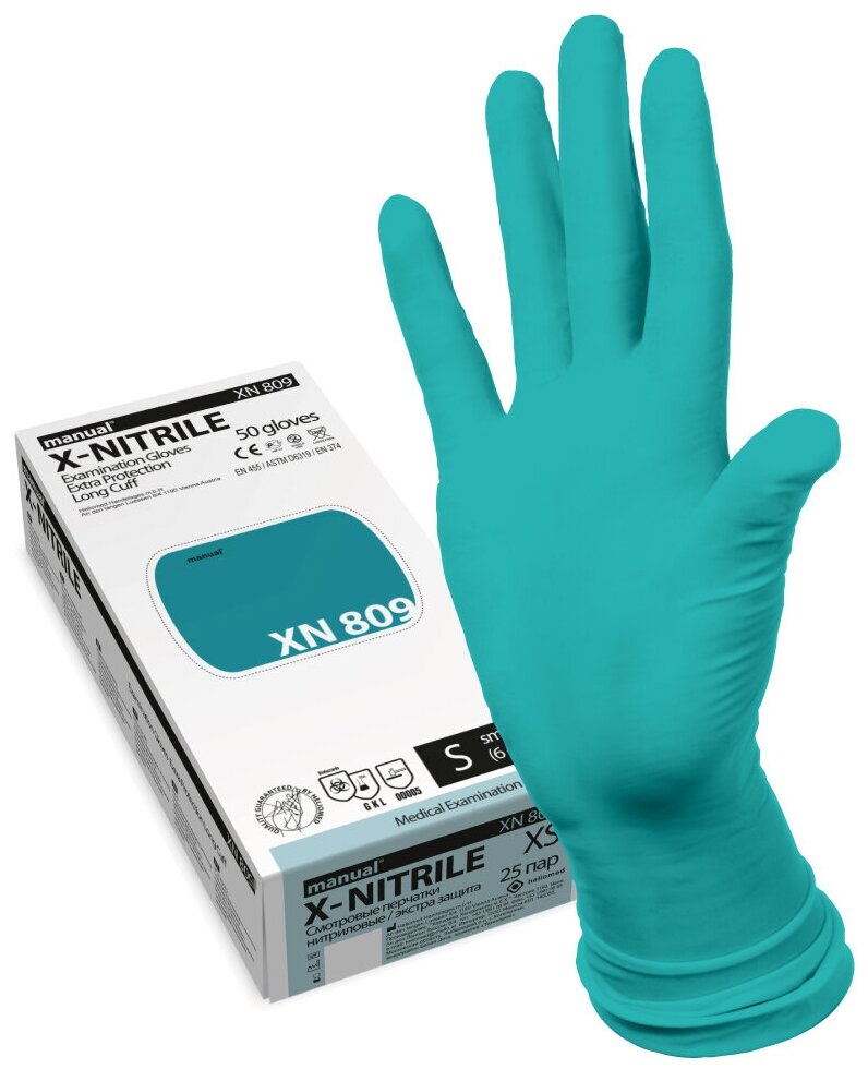 Перчатки нитриловые повышенной прочности с удлиненной манжетой Manual XN 809 сине-зеленый (25 пар, M)