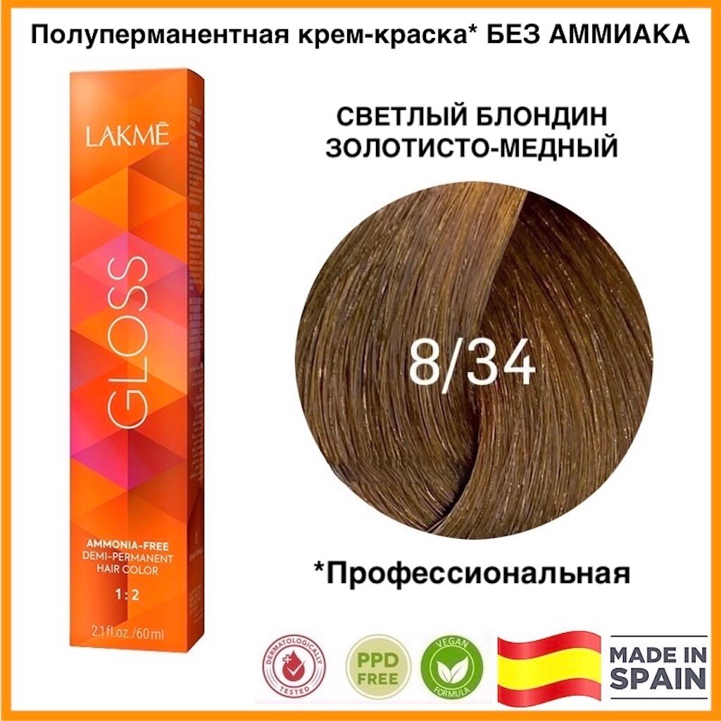 LAKMÉ, GLOSS, Крем-краска для волос тонирующая №8/34, светло-белокурый золотистый медно-красный, 60 мл