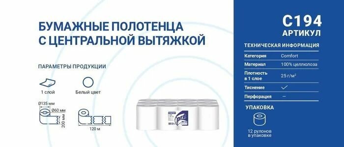 Полотенца бумажные PROtissue Comfort C194 однослойные, с центральной вытяжкой, 1 упаковка - 12 рулонов по 120 метров