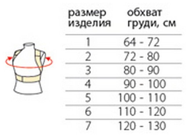 1- охват груди 64-72 2- 72-80 3- 80-90 4- 90-100 5- 100-110 6- 110-120 7- 120-130 У меня 80, но заказала 4 и не прогадала Очень довольна Но! Носить лучше, заранее обсудив с лечащим врачом Если профилактика, то инструкция очень хорошая За такие деньги - отличный товар |
