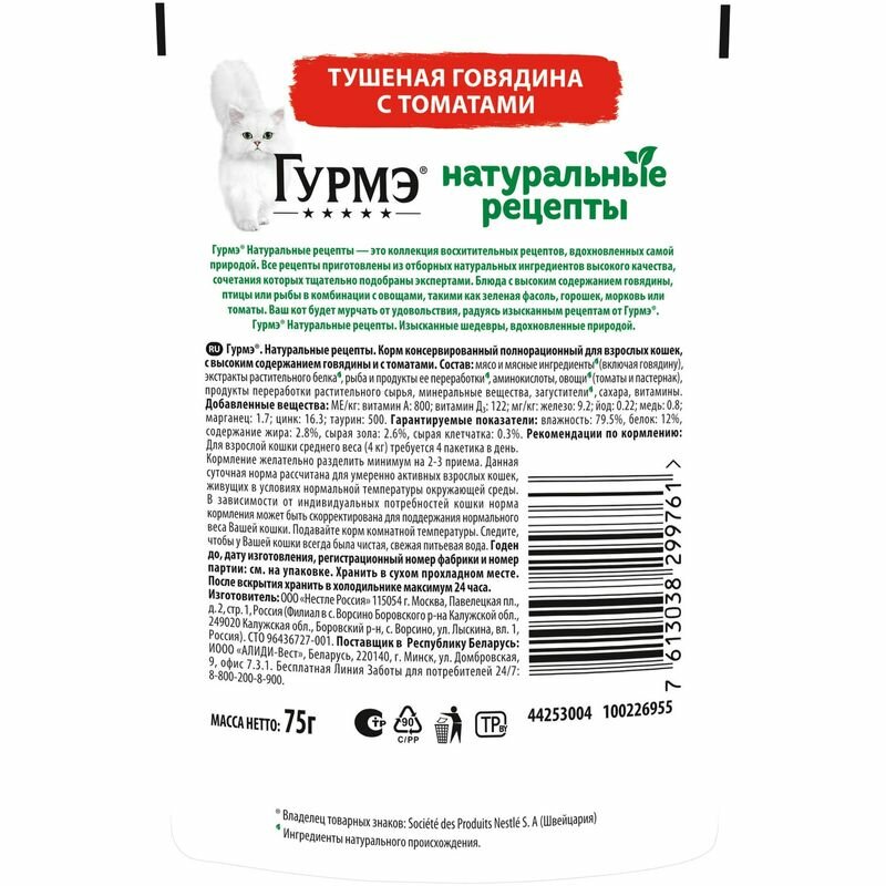 Влажный корм, "Гурмэ Натуральные рецепты", со вкусом тушёной говядины с томатами, 75г 13 шт