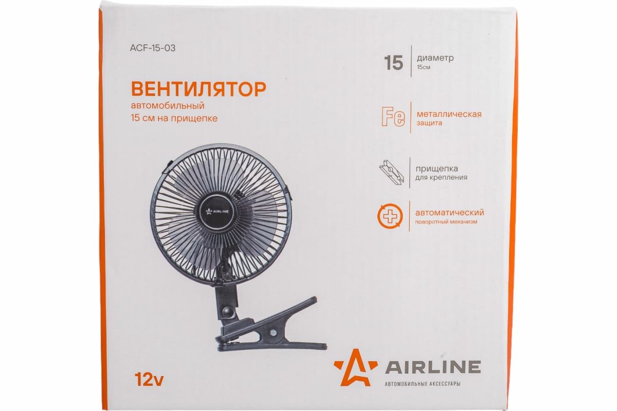 Вентилятор 3-х лопастной airline acf-15-03 на прищепке с автоповоротом металл 15см 12в