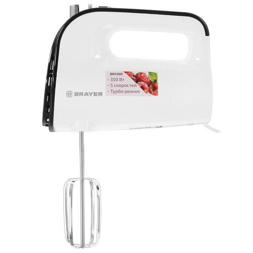 Brayer 1300BR Миксер350 Вт, 5 скорост, 2 венчика, 2 насадки для замеса, Turbo, белый .