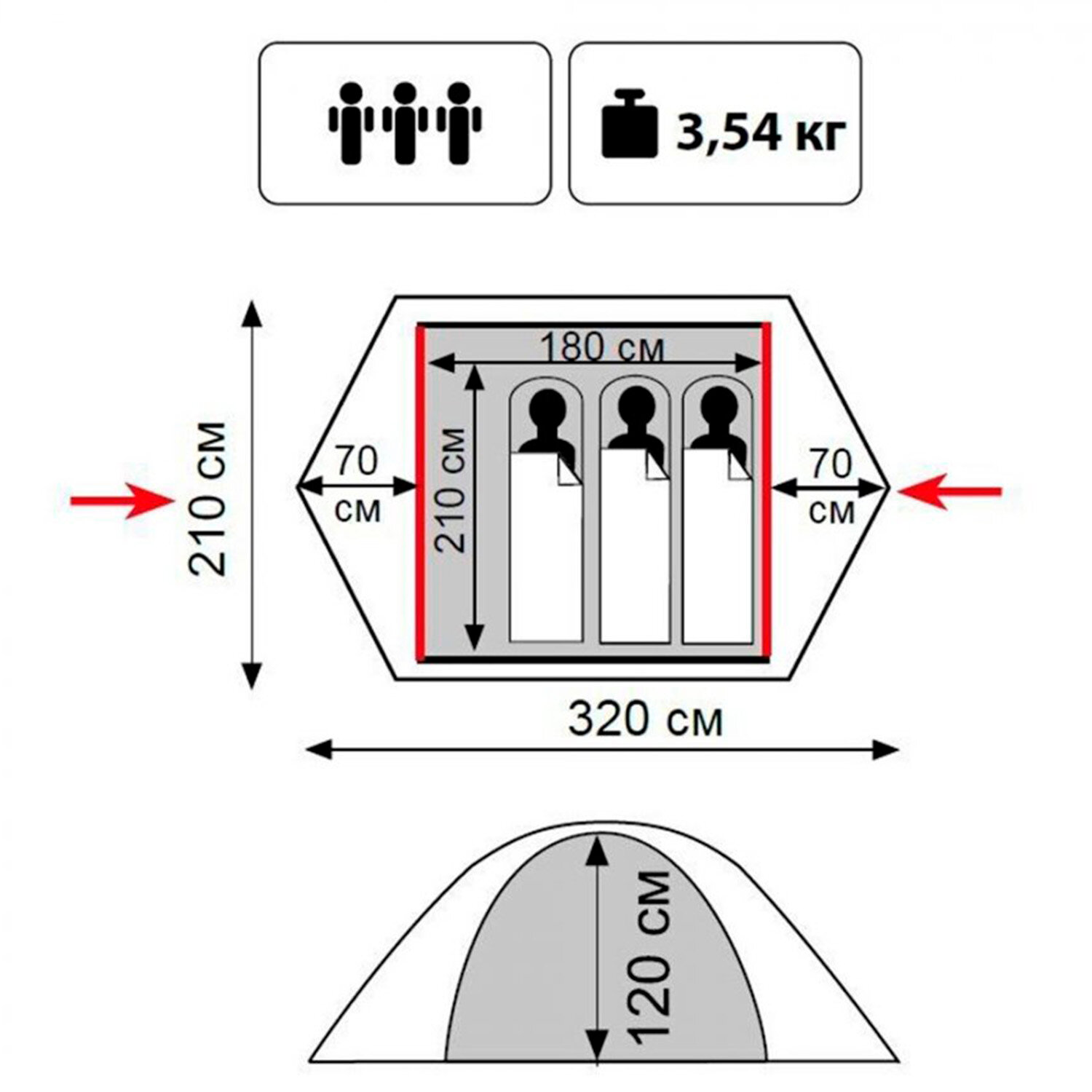 | Габариты внешней палатки(ДxШxВ) | 250x220x120 cм |