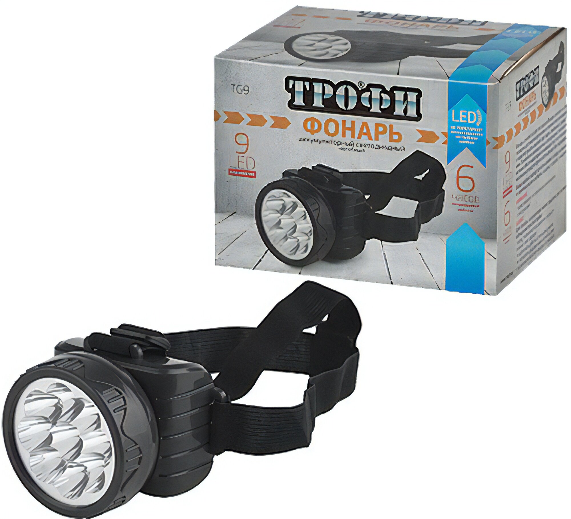 Фонарь TG9 налобный аккум. 4В 0.9А.ч 9хLED ЗУ 220В карт. упак. Трофи C0045557 (6шт.в упак.)