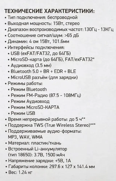 | Плюсы: | Крепкая колонка, сделана качественно.Кнопки легко нажимаются и не заедают, такая проблема была в моей старой колонке. Звук объёмный, не искажает, не хрипит даже на высокой громкости. Работает до 5 часов без подзарядки. Хорошо ловит радио. Заряжается до полной зарядки 2 часа. |