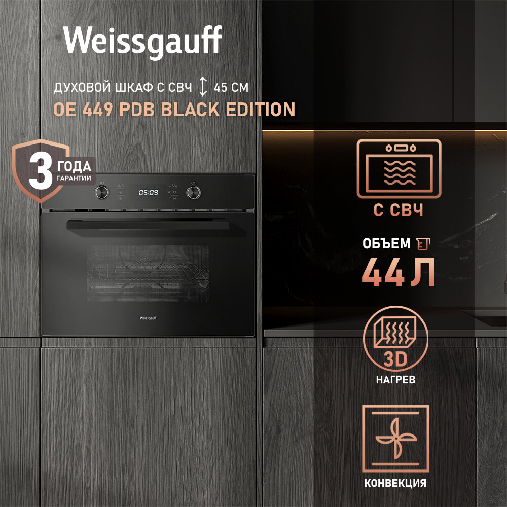 Электрический духовой шкаф Weissgauff OE 449 PDB Black Edition с СВЧ, конвекцией, 55 см, 3 года гарантии
