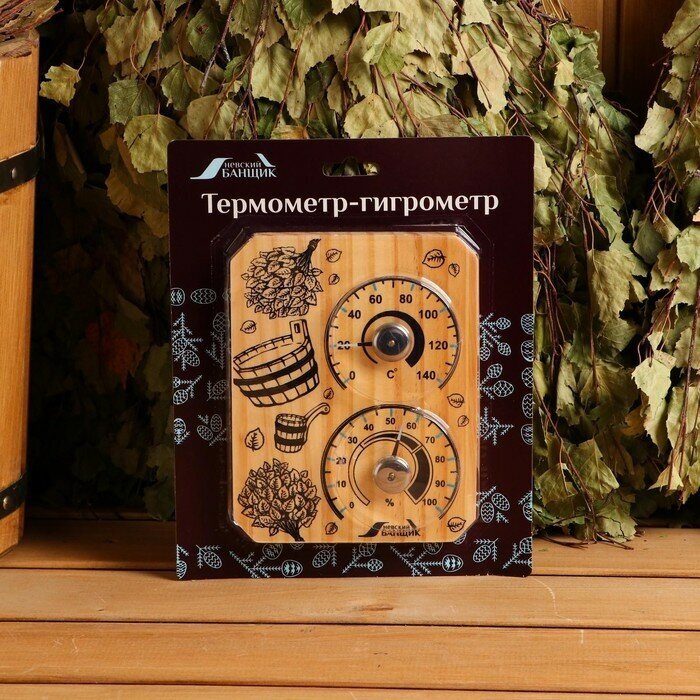 Деревянный термометр+гигрометр для бани и сауны "Банщик", 14*18 см, микс интересное: