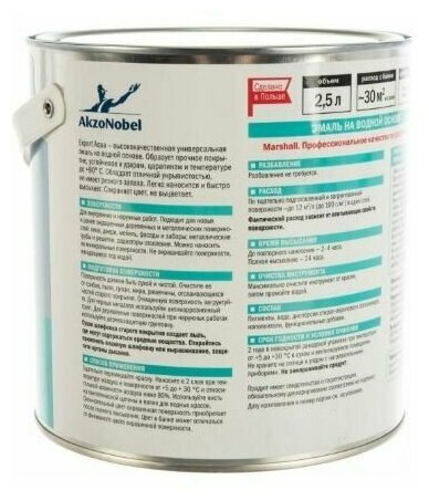 Эмаль по дереву и металлу Marshall Export Aqua 30, полуматовая(2,5л) белый