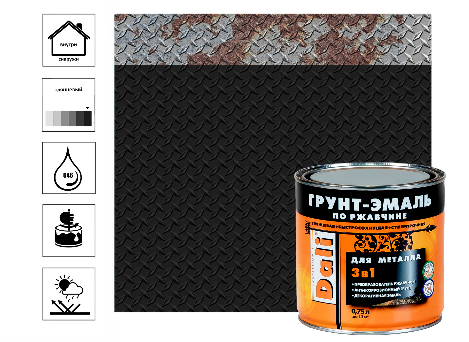 Dali / Дали Грунт-эмаль по ржавчине 3 в 1 гладкая алкидная RAL 9005 Черная 0,75л