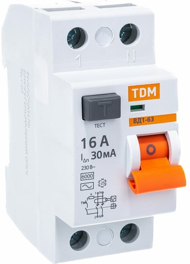 ТДМ Электрик ВД1-63 УЗО 2Р 16А хар-ка АС 30мА / TDM Electric ВД1-63 устройство защитного отключения 2 полюса 16А хар-ка АС 30мА