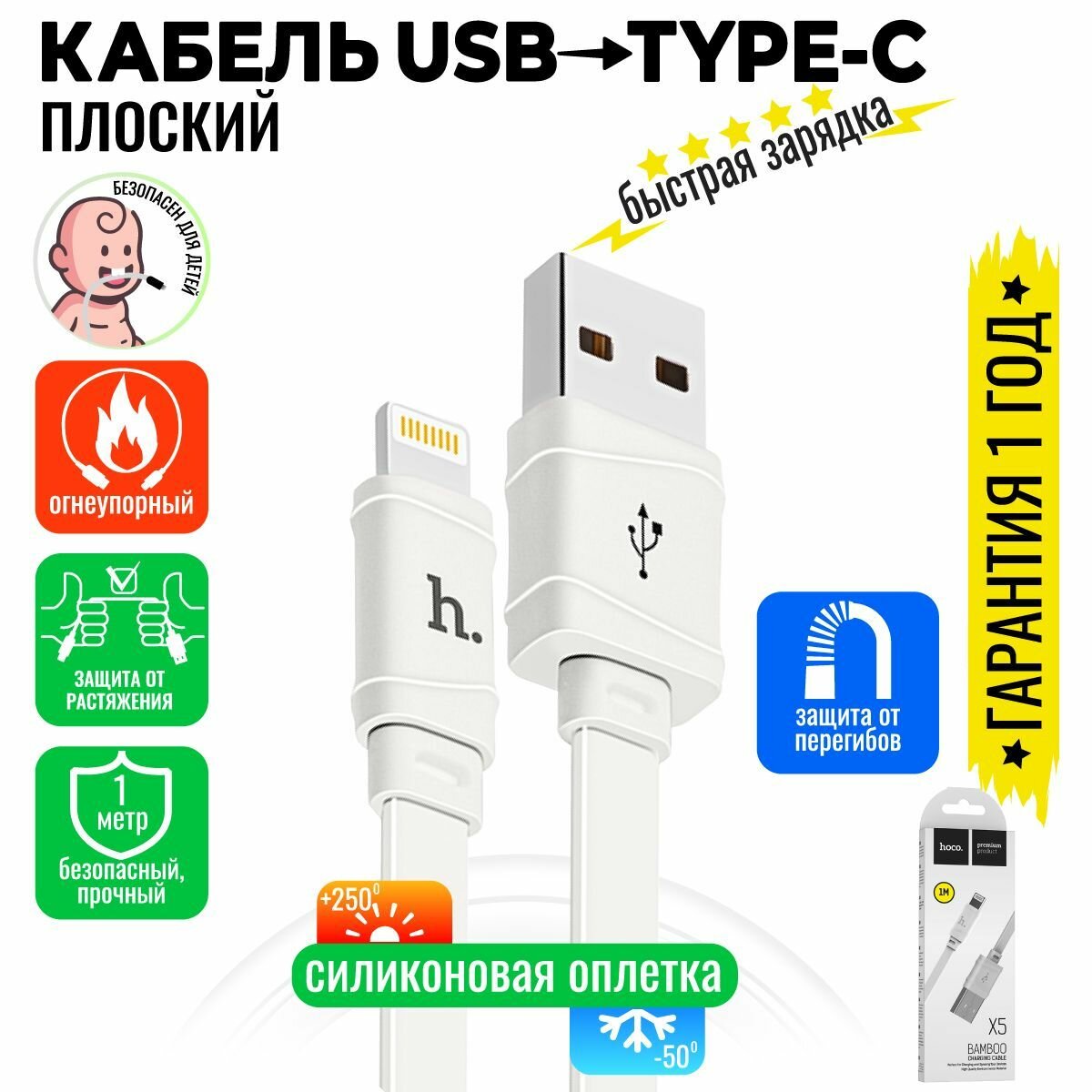 Кабель Hoco X5, USB - Type-C, 2.4 А, 1 м, плоский, белый