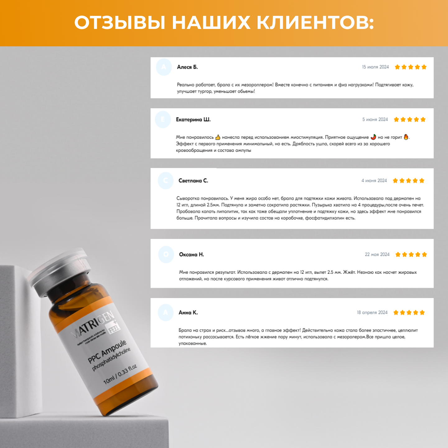 Ниже Вы можете прочитать отзывы на Matrigen PPC Жиросжигающая / антицеллюлитная сыворотка для тела для похудения 1 ампула х 10 мл, ознакомится с подробными характеристиками, посмотреть интересные обзоры и фотографии на Matrigen PPC Жиросжигающая / антицеллюлитная сыворотка для тела для похудения 1 ампула х 10 мл.