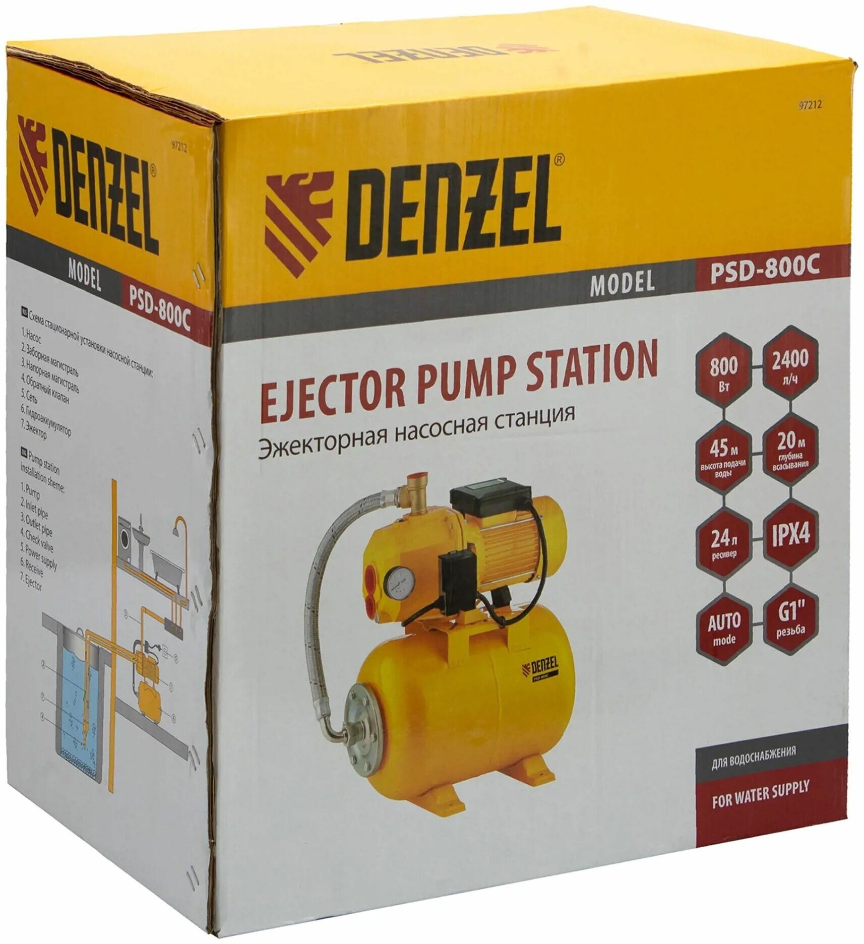 Насосная станция эжекторная PSD800C, 800 Вт, 2400 л/ч, ресивер 24 л, всасывание 20 м// Denzel 97212 .
