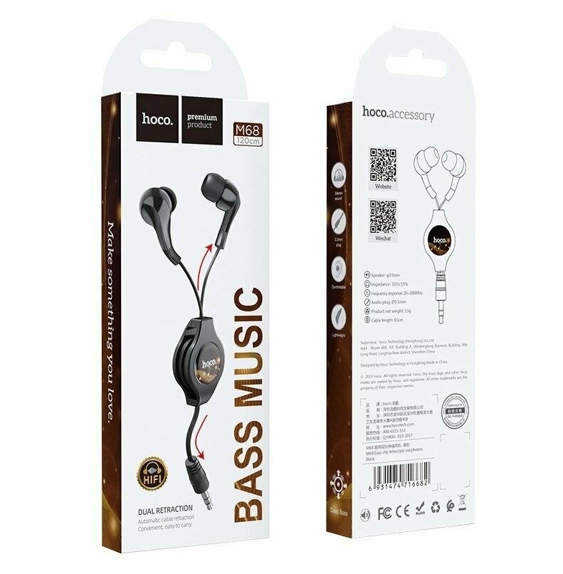 Проводные наушники HOCO M68 Easy clip, Jack 3.5mm, 65 см, черный