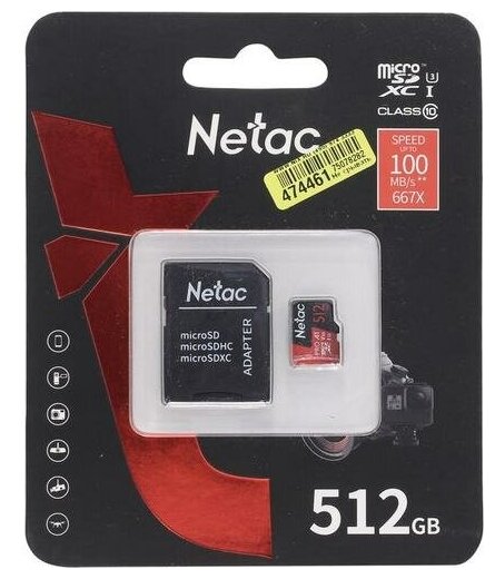 Карта памяти microSDXC UHS-I U3 NETAC P500 Extreme Pro 512 ГБ, 100 МБ/с, Class 10, NT02P500PRO-512G-R, 1 шт., переходник SD