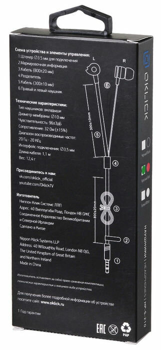 OKLICK HP-S-210 наушники вкладыши проводные 1,2 м (черный)