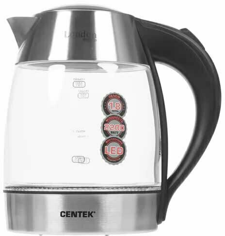 Чайник Centek CT-0059 London, стекло, 1.8л, 2200Вт, LED-подсветка, отделка нерж.