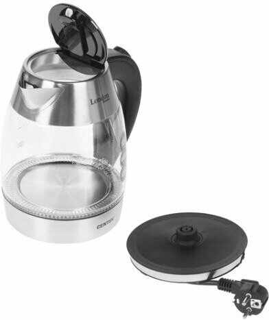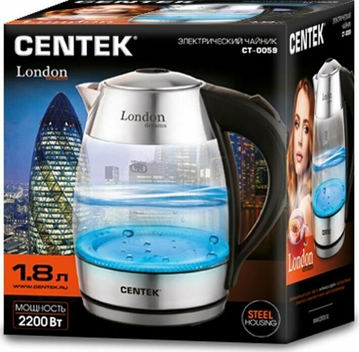 Чайник Centek CT-0059 London, стекло, 1.8л, 2200Вт, LED-подсветка, отделка нерж.
