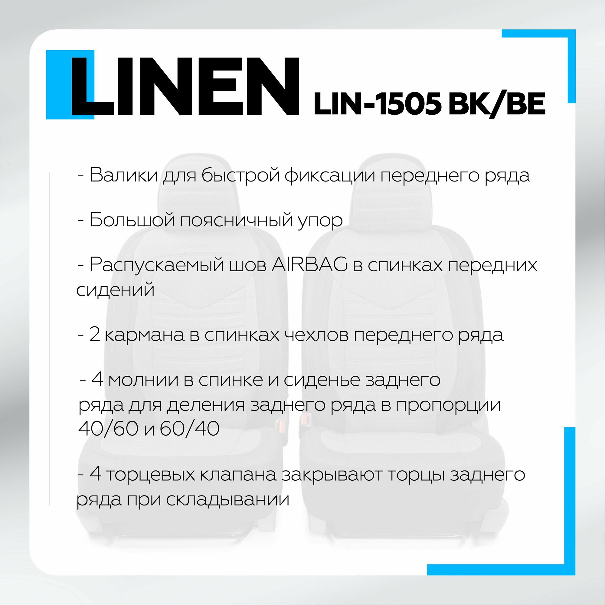 Lin-1505 Bk/L.gy Авточехлы Linen, Материал Лён Крупного Плетения, 5 Мм Поролон, Новое Лекало - 3D Крой, 15 Предметов, Валики ...