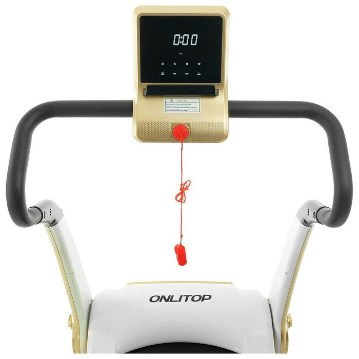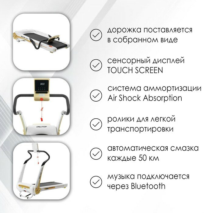 Беговая дорожка ONLITOP "MINI3", электрическая, размер в рабочем состоянии 150,5 х 73,8 х 124 см, амортизация, максимальный вес 130 кг, сенсорный дисплей, скорость до 12 км/ч, цвет белый, золотой
