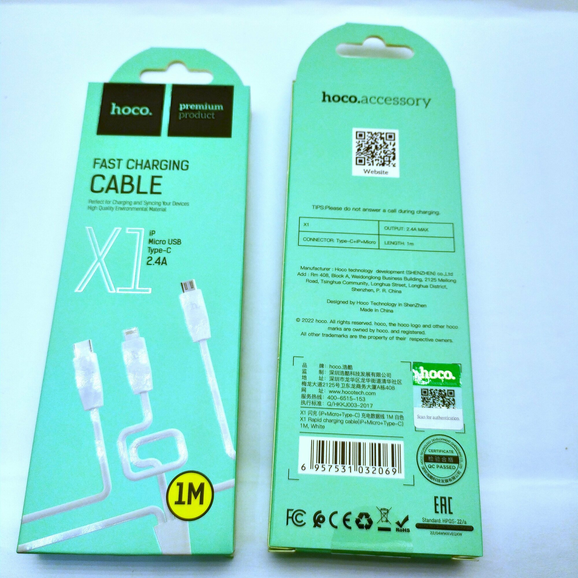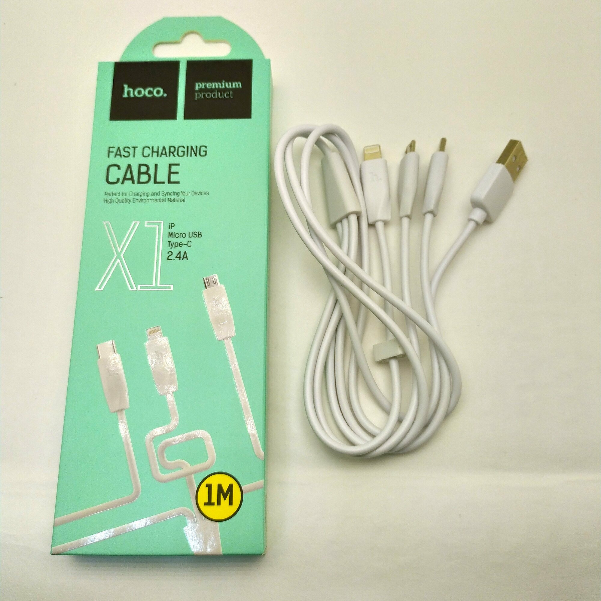 Кабель для быстрой зарядки Hoco X1 3в1 (Micro+ Lightning+Type-C) ,белый, 1 м.
