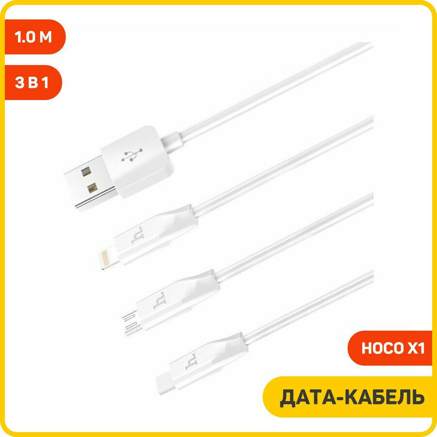 Дата-кабель Hoco X1 (3 в 1) USB-MicroUSB/Lightning/Type-C (2.1 А), 1 м, белый