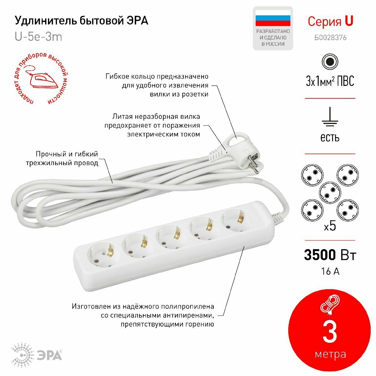 Удлинитель ЭРА, 5 роз/3м/3х1мм/16А/3500Вт, с заземл, белый, U-5e-3m-3x1