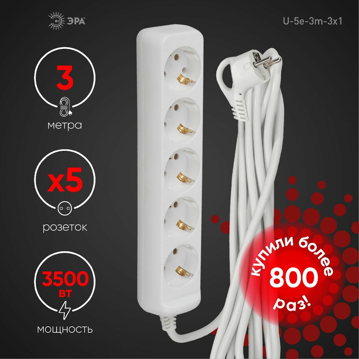Удлинитель Эра 5 розеток 3 метра U-5e-3m-3x1 1087536