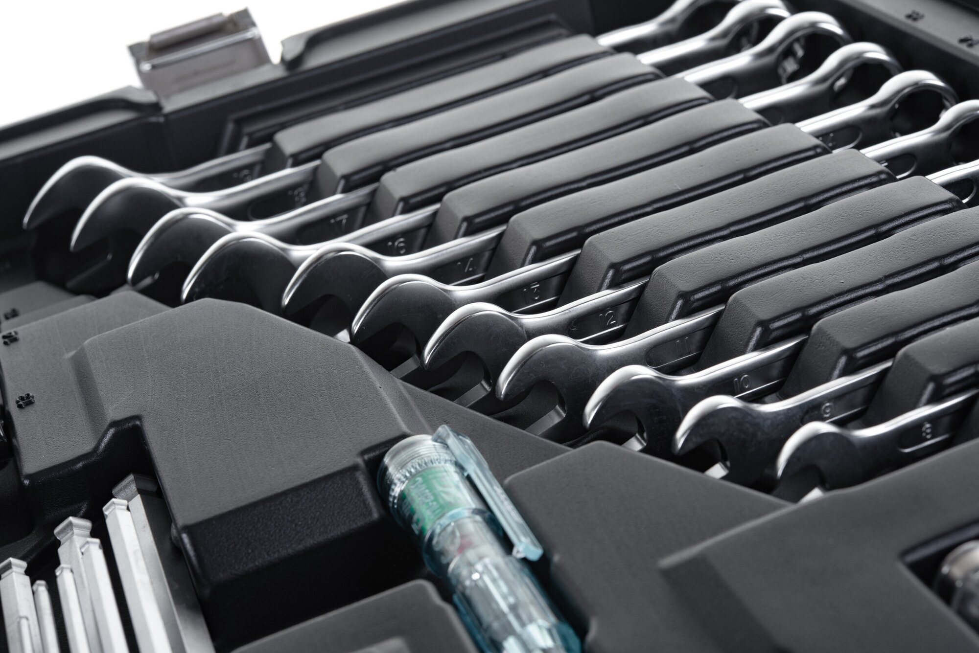 | Гаечные ключи подробно | 1/4" трещоточный ключ – 72 зубца; 3/8" трещоточный ключ – 72 зубца; 1/2" трещоточный ключ – 72 зубца; комбинированные ключи – 8; 9; 10; 11; 12; 13; 14; 16; 17; 18; 19 мм. |