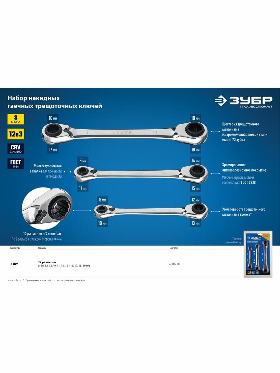 Набор накидных трещоточных гаечных ключей ЗУБР Профессионал 3 шт 8-19 мм ( 27105-H3 )