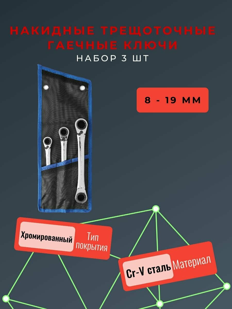 Набор накидных гаечных ключей трещоточных 3 шт, 8 - 19 мм, ЗУБР
