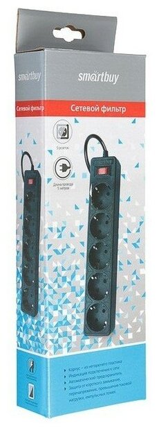 Сетевой фильтр SmartBuy ONE 10А, 2,2 кВт, 5 гнезд, 5 метров, черный.