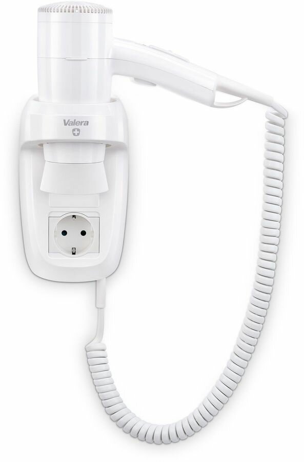 Фен настенный Valera Hospitality Premium Smart 1200 Socket (533.03/032.02), мощность 1200 Вт, безопасная кнопка включения/выключения, настенный держатель с выключателем, розетка 16А, спиральный сетевой кабель, холодный воздух, концентратор