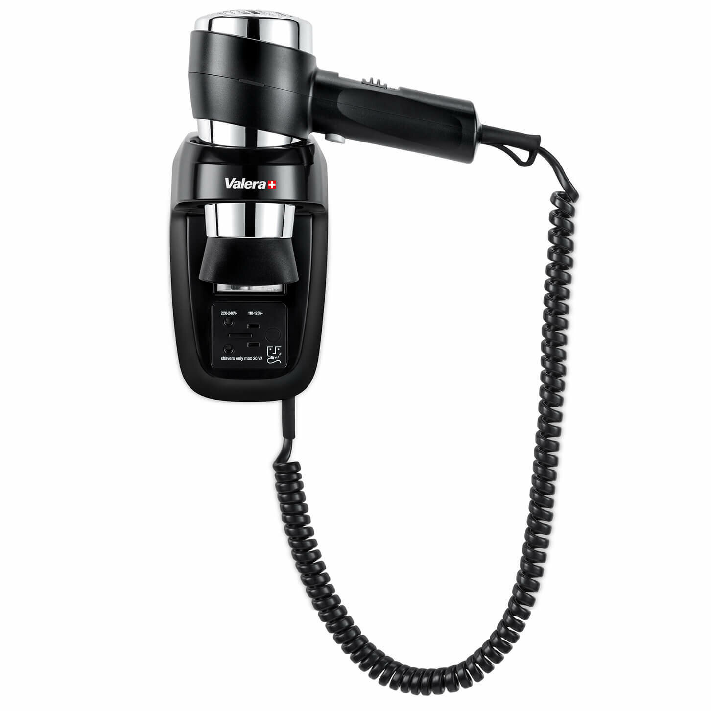 Купить Фен настенный Valera Hospitality Action Protect 1600 Shaver (542.06/044.06 black), мощность 1600 Вт, безопасная кнопка включения/выключения, настенный держатель c устройством защитного отключения, розетка для бритвы, холодный воздух, концентратор