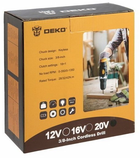Ниже Вы можете прочитать отзывы на DEKO Дрель-шуруповерт Deko DKCD20FU-Li, 20 В, 1.5 Ач, Li-lon,32 Нм, 350/1350 об/мин, ознакомится с подробными характеристиками, посмотреть интересные обзоры и фотографии на DEKO Дрель-шуруповерт Deko DKCD20FU-Li, 20 В, 1.5 Ач, Li-lon,32 Нм, 350/1350 об/мин.