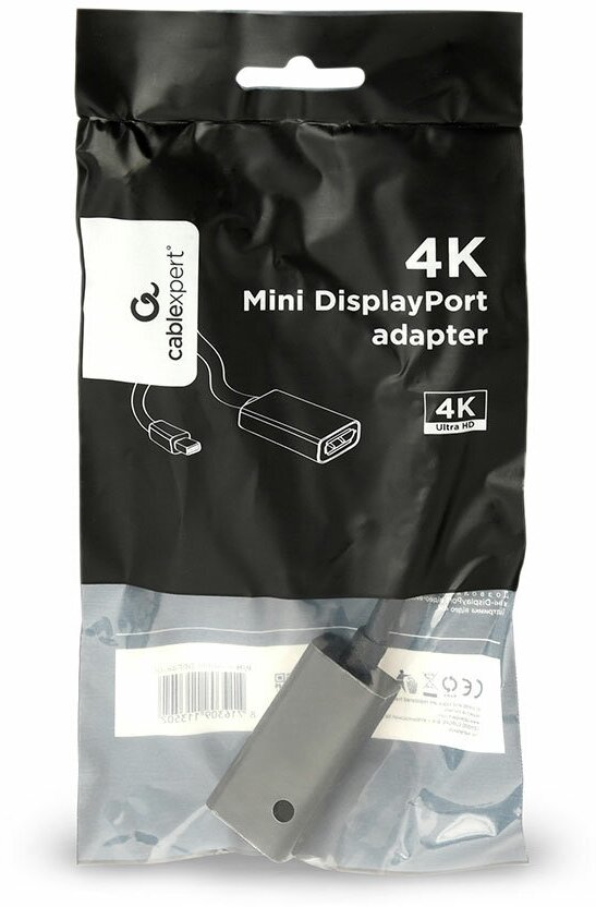 Переходник miniDisplayPort - DisplayPort, Cablexpert, 4K, 20M/20F, длина 16см, черный