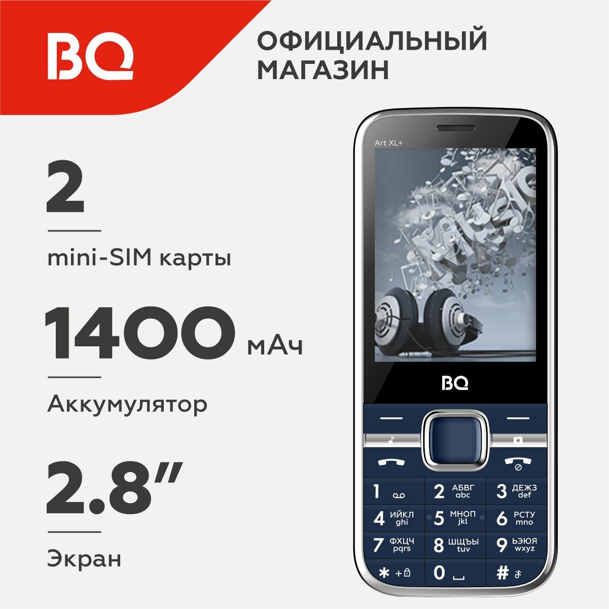 Сотовый телефон BQ BQ-2838 Art XL+ Blue (2sim/2.8"/320*240/32Mb/microSD/0.08Мп/Bt/1400мАч/моноблок)