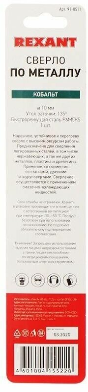 Сверло по металлу 10 мм «Кобальт» (сталь HSS-Co 5 M35 P6M5K5) (1 шт. в блистере) DIN 338, REXANT 910511 (1 упак) интересное: