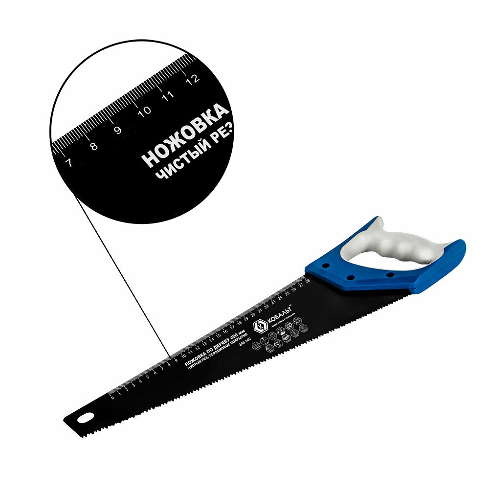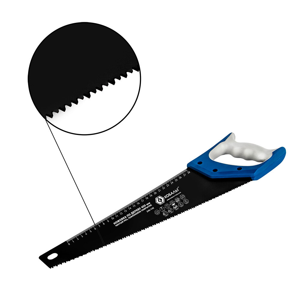 Ножовка по дереву кобальт 400 мм, шаг 3,5 мм/ 7 TPI, тефлоновое покрытиезакаленный зуб, 3D-заточка, двухкомпонентная рукоятка, чистый рез