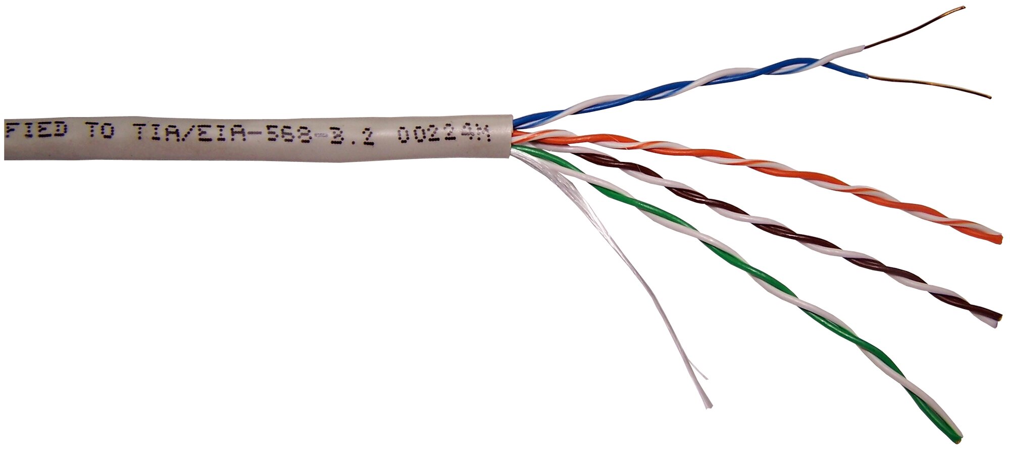 Кабель витая пара U/UTP 5e кат. 4 пары TWT TWT-5EUTP-XS/100 25AWG(0.45 мм), медь, одножильный (solid), внутренний, PVC, серый, уп/100м