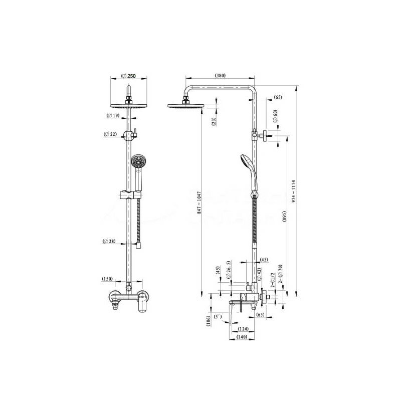 | Дополнительная информация | высота стойки для душа: 1174 мм; диаметр душевой лейки: 110 мм; диаметр верхнего душа: 250 мм |