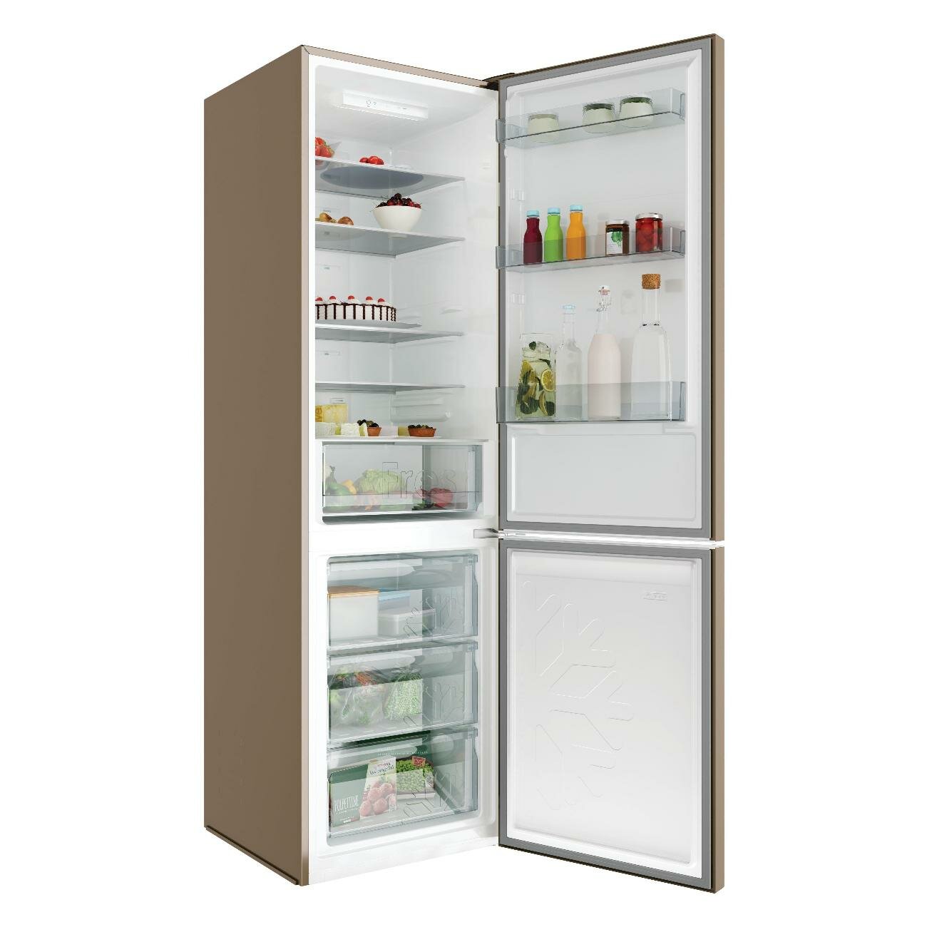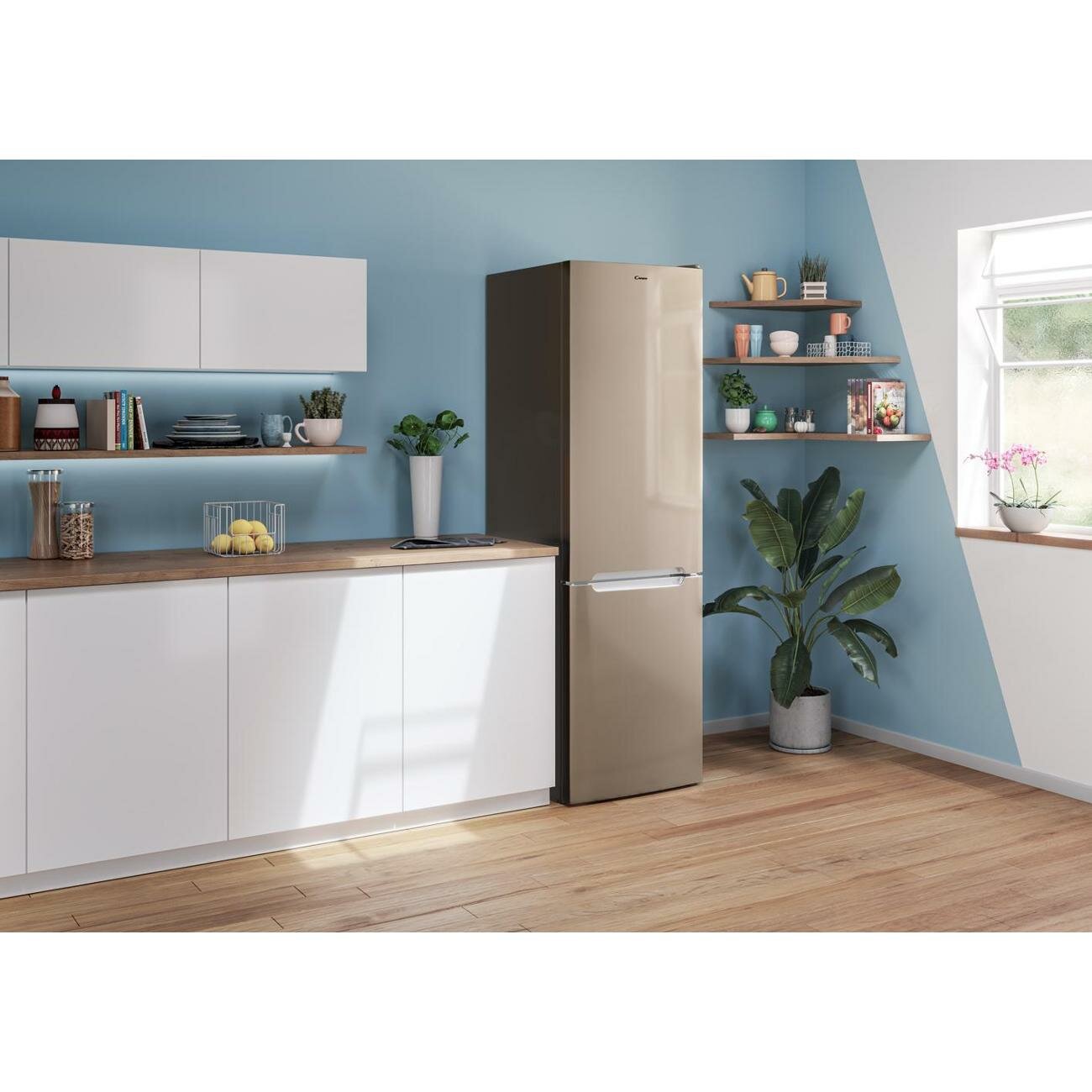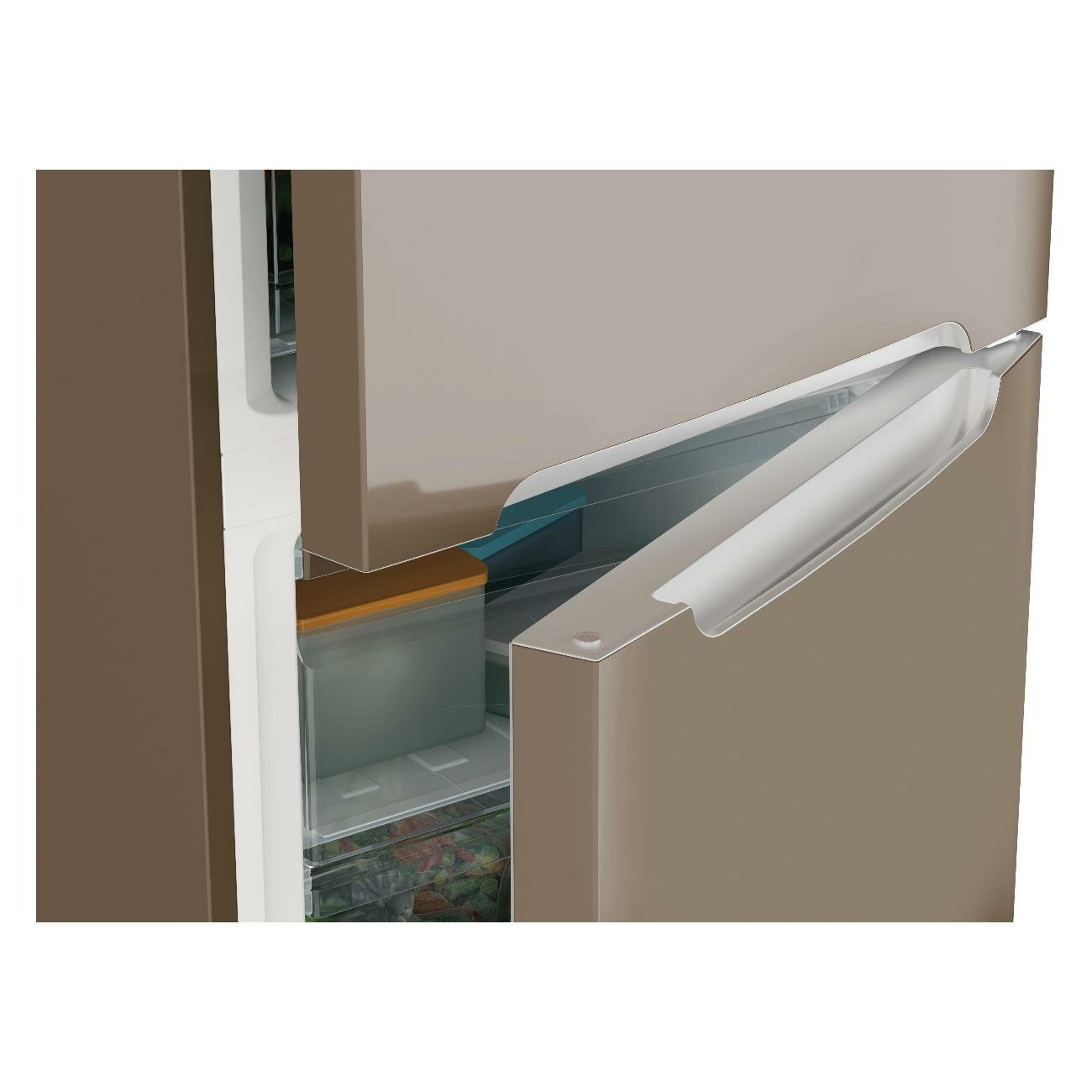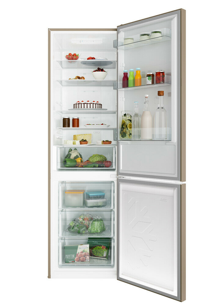 Холодильник Candy No Frost Plus+ CCRN 6200G двухкамерный, полезный объем 370 л, электронное управление, перенавешиваемые двери, автономное сохранение холода до 10 ч, режим суперохлаждения, LED-освещение, звуковое оповещение об открытой двери, золотой