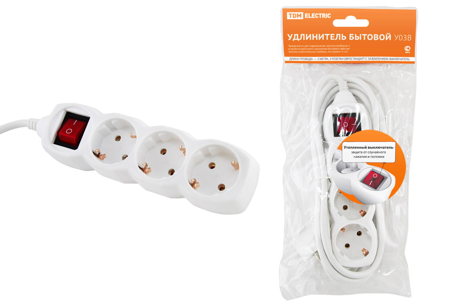 Удлинитель бытовой TDM У03В, 3 гнезда, с заземлением и выключателем, ПВС 3x1, 5м