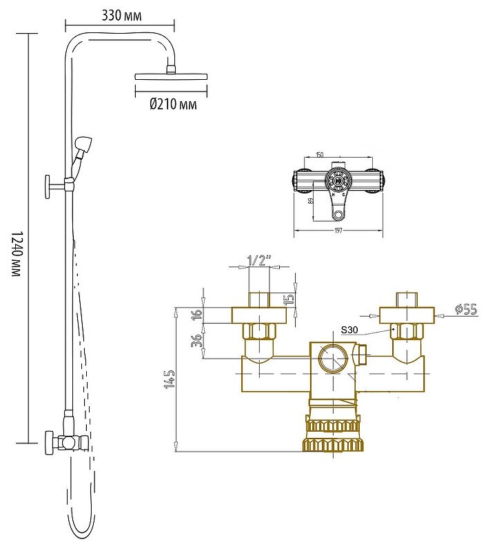 | Дополнительная информация | высота стойки для душа: 1240 мм; диаметр верхнего душа: 210 мм |