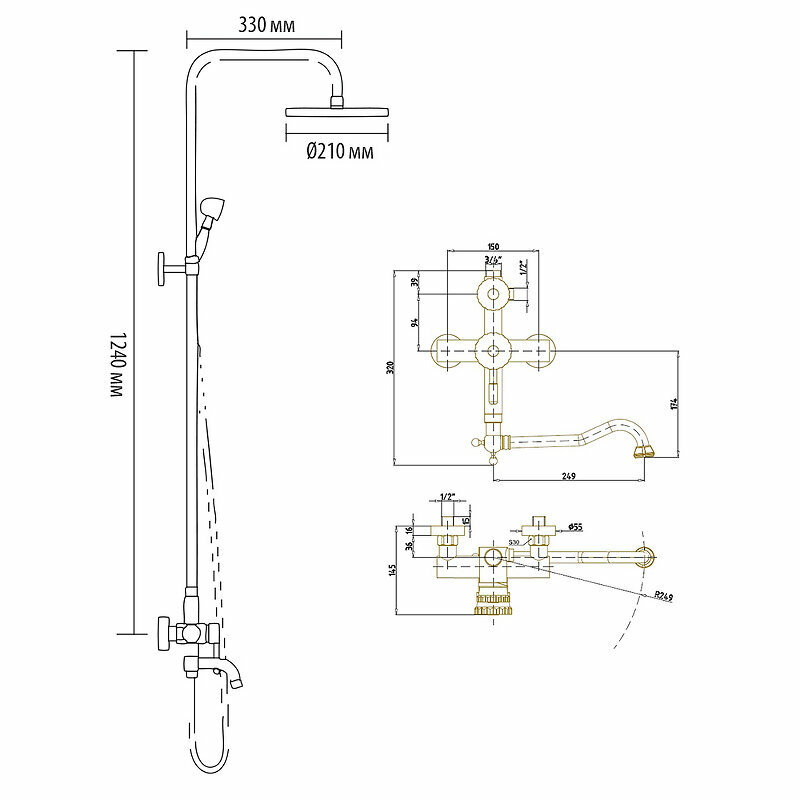 | Дополнительная информация | высота стойки для душа: 1240 мм; диаметр верхнего душа: 210 мм |