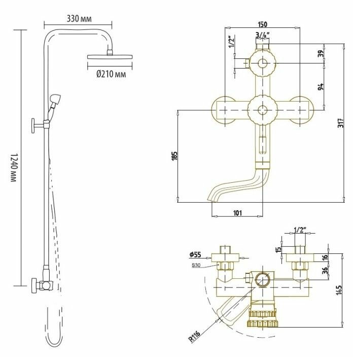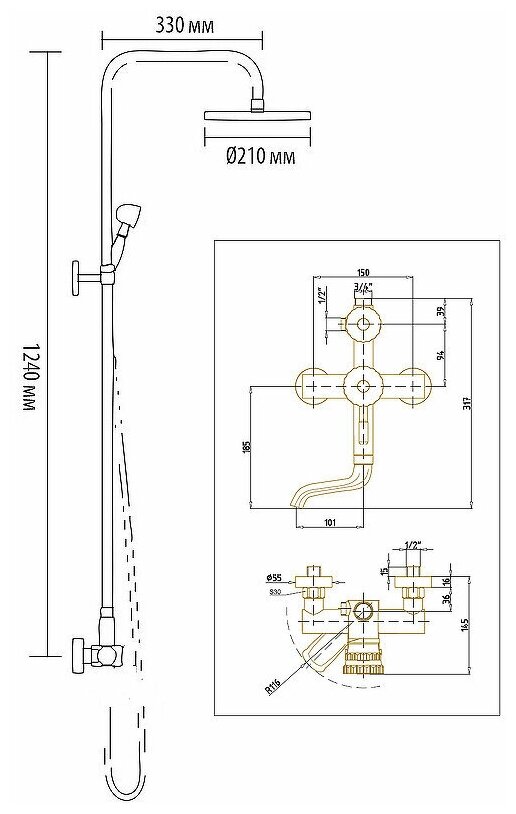 | Дополнительная информация | высота стойки для душа: 1240 мм; диаметр верхнего душа: 210 мм |