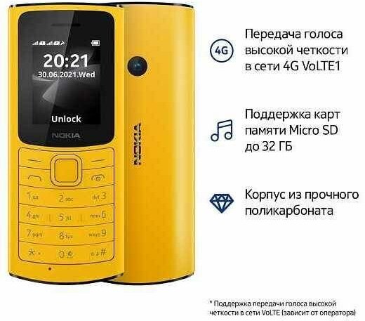 Мобильный телефон Nokia 110 4G DS 0.048 желтый моноблок 3G 4G 2Sim 1.8 240x320 Series 30+ 0.3Mpix GSM900/1800 MP3 FM microSD max32Gb