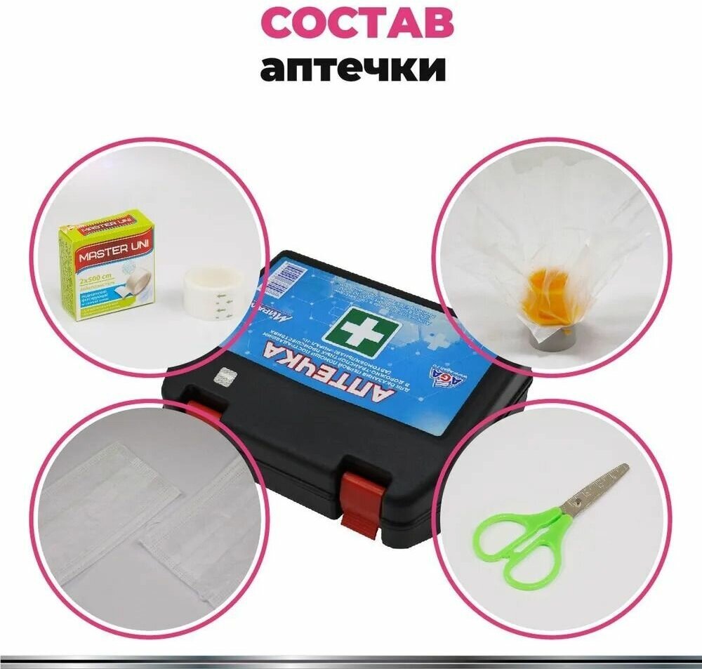 | Состав | 1. Медицинские изделия: - Маска медицинская нестерильная одноразовая - 2 шт. - Перчатки медицинские нестерильные, размером не менее М - 2 пары - Устройство для проведения искусственного дыхания «Рот-Устройство-Рот» - 1 шт. - Жгут кровоостанавливающий для остановки артериального кровотечения - 1 шт. - Бинт марлевый медицинский размером не менее 5 м * 10 см - 4 шт. - Бинт марлевый медицинский размером не менее 7 м * 14 см - 3 шт. - Салфетки марлевые медицинские стерильные размером не менее 16 * 14 см № 10 - 2 уп. - Лейкопластырь фиксирующий рулонный размером не менее 2 * 500 см - 1 шт. 2. Прочие средства: - Ножницы - 1 шт. - Инструкция по оказанию первой помощи с применением аптечки для оказания первой помощи пострадавшим в дорожно-транспортных происшествиях (автомобильной) - 1 шт. - Футляр - 1 шт. |