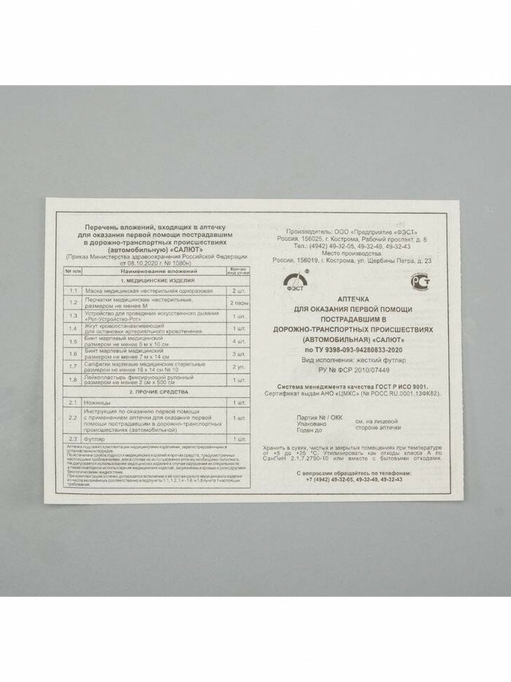 Аптечка автомобильная ФЭСТ футляр из полистирола, новый состав по приказу № 1080Н от 08.10.20